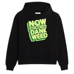 Adorning the front is a graphic cleverly echoing the famed “Now That’s What I Call Music!” emblem, ingeniously altered to include “Dank Weed” in a noticeable, bold typeface. Set against the hoodie’s deep black hue, the logo in vivid greens and yellows ensures it catches the eye and injects a dose of wit.