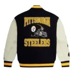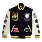 This Snoop Dogg-inspired Pittsburgh Steelers OVO Jacket merges urban chic with devoted team pride. Cloaked in a sleek black, it commands attention with dynamic yellow stripes at the cuffs and base. The jacket boasts a collection of elaborate emblems, spotlighting the famed Steelers symbol as a tribute to the team’s celebrated past, alongside the prominent OVO owl mark that signifies the unique partnership with the artist. Ideal for those desiring to express their dedication with a dash of celebrity-inspired fashion, this jacket stands out as both a vibrant declaration of style and an honor to the Steelers’ distinguished legacy.