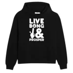 - Design: Featuring the playful phrase “LIVE BONG & PROSPER,” the hoodie gives a cheeky twist to a classic salutation. Accompanied by a graphic that humorously combines the traditional Vulcan salute with a bong, this design captures a spirit of camaraderie and enjoyment.